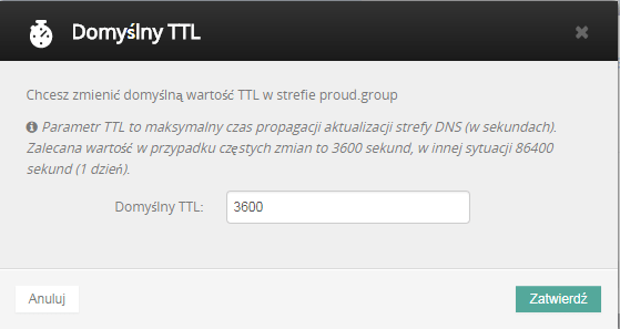 Jak widać wartość TTL jest ustawiana domyślnie. Można jednak ją edytować – otworzy się wtedy takie okno.